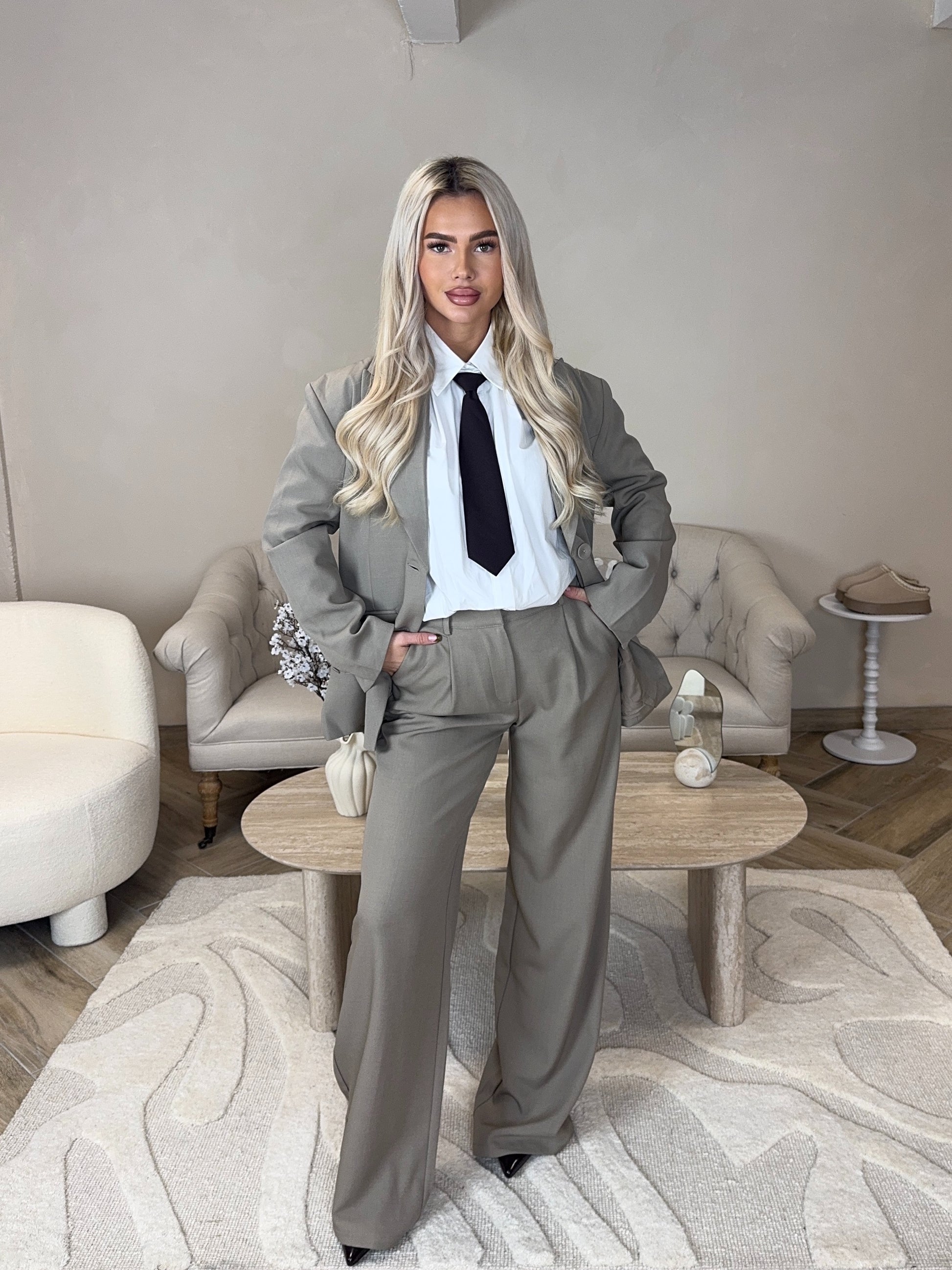 Cet ensemble tailleur beige incarne l'élégance intemporelle et la sophistication. Composé d'un blazer structuré et d'un pantalon assorti, il offre une silhouette épurée et professionnelle. La teinte beige neutre s'adapte à tous les teints et se marie facilement avec vos accessoires existants.